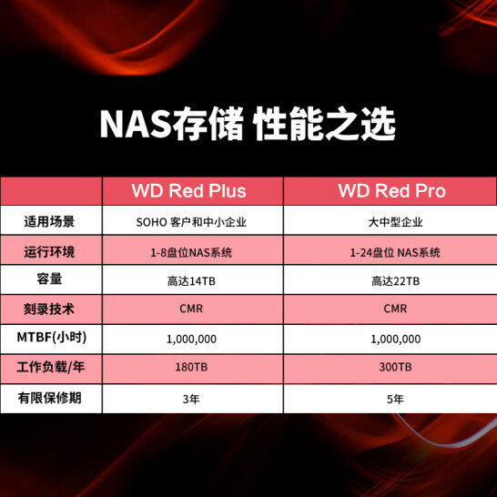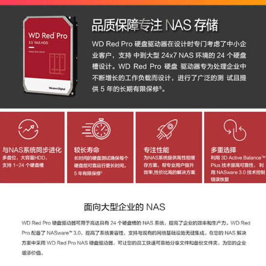 WD Red™ Pro 专为大中企业客户而设计,适用于多达 24 个盘位的 NAS 系统。WD Red™ Pro 专为处理 24×7 全天候环境中的高强度工作负载而设计,是存档和共享以及在扩展操作系统(例如 ZFS 或其他文件系统)上进行 RAID 阵列重建的理想选择。这些硬盘使您的员工可以快速可靠地在您的 NAS 解决方案中共享文件和备份文件夹,为您的企业带来更大的价值。